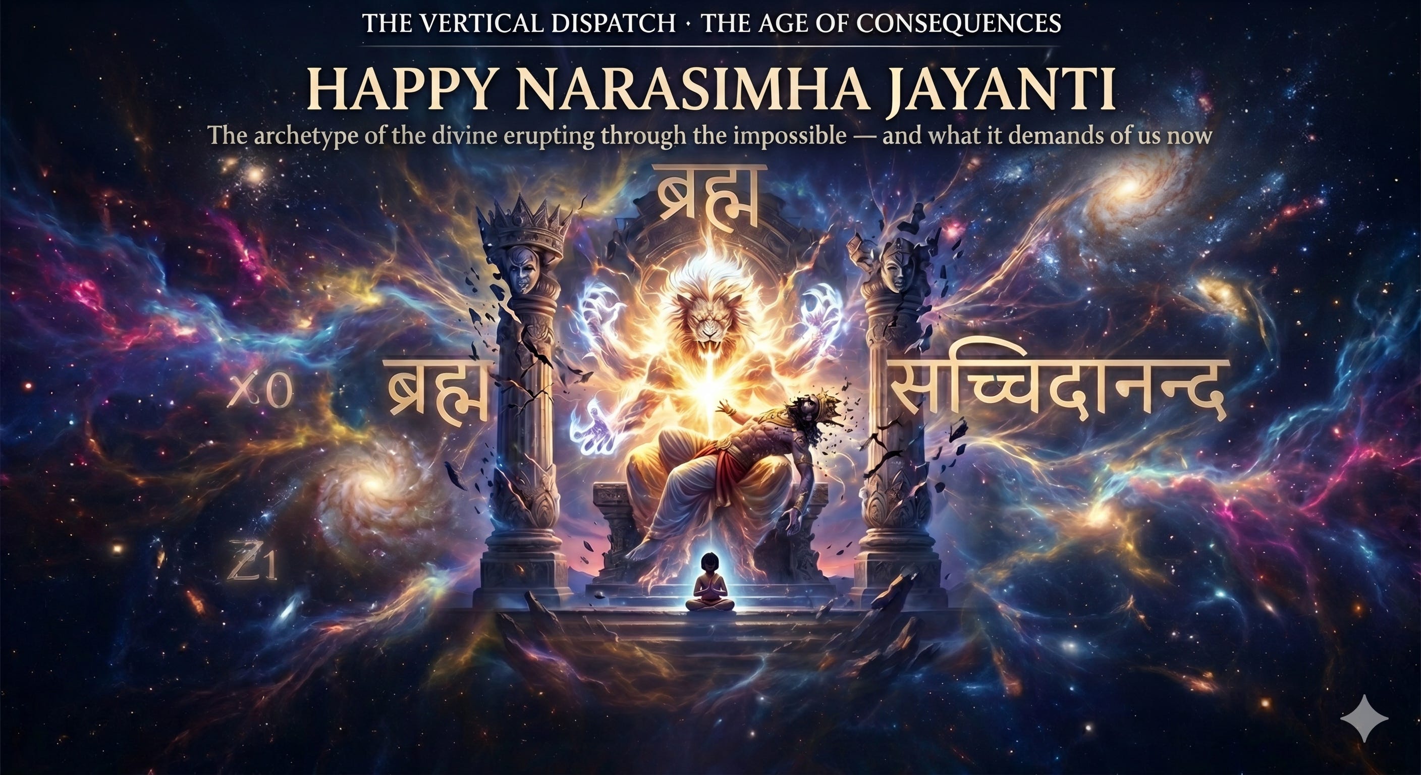 #NarasimhaJayanti #TheVerticalDispatch #AgeOfConsequences #AvatarArchetype #VedicTradition #SacredMetaphysics #UniversalDynamics #Archetype #Z0 #EgoAndGod #Eschatology #Prahlada #Hiranyakashipu #ManLion #Vishnu #ThePatternIsAlwaysNow #GlenRoberts #Bhakti #NonDual #SanatanaDharma