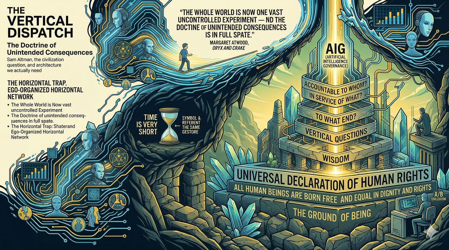 #TheVerticalDispatch #AIGovernance #AIG #SamAltman #TechEthics #UniversalDeclarationOfHumanRights #HumanRights #ArtificialIntelligence #MargaretAtwood #OryxAndCrake #FutureOfCivilization #VerticalArchitecture #DoctrineOfUnintendedConsequences #DigitalGovernance #GroundOfBeing #VerticalThinking #AIGvsAGI #GovernanceReform #CivilizationalScale #TechnoCapitalism #WisdomInTech #TheArchitect #SubstackWriters