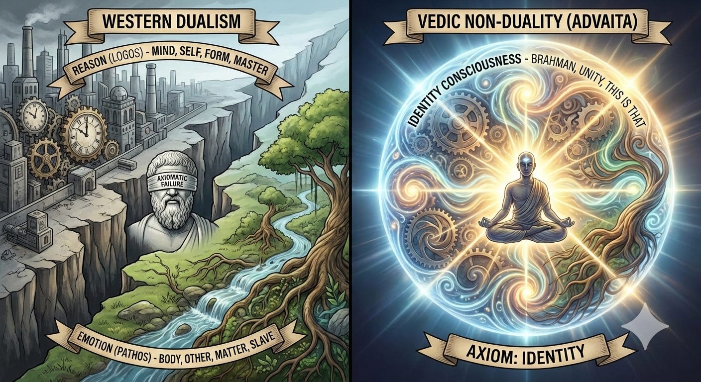 When the first axiom is Identity Consciousness (the recognition that Atman is Brahman), the “Logic of Inferiority” becomes a logical impossibility. You cannot categorize another as “inferior” if you recognize that their essential nature is identical to yours. The “Moral Blindness” of the West is replaced by the “Vedic Vision” of the Self-in-all.