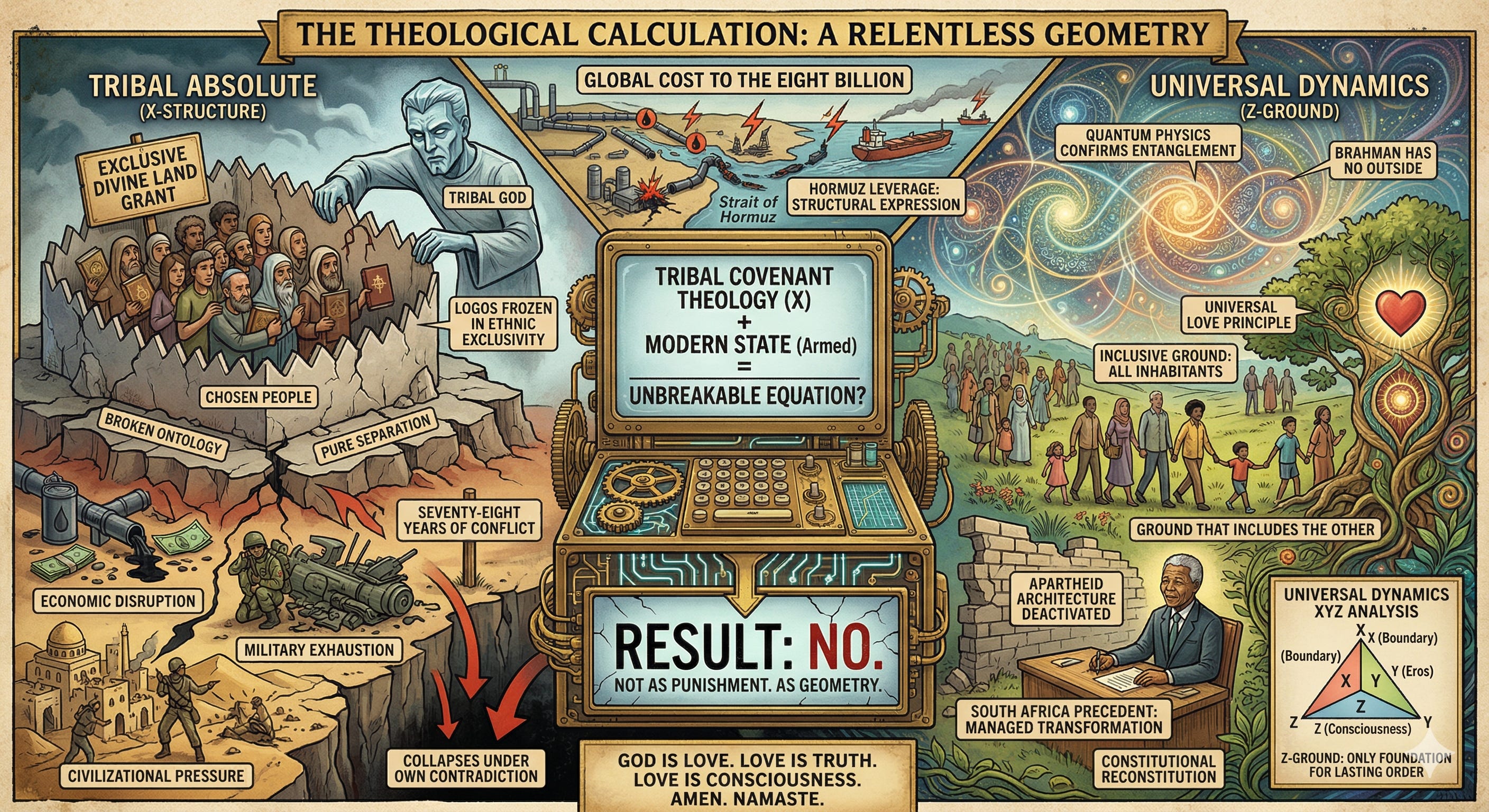 #TheologicalCalculation #RelentlessGeometry #IsraelIranUS #UniversalDynamics #TribalAbsolute #ApartheidIsrael #SouthAfricaPrecedent #ManagedTransformation #ZGround #BrahmanHasNoOutside #QuantumPhysicsEntanglement #Geopolitics #StraitOfHormuz #GlobalCost #MiddleEastPeace #XYZAnalysis #XStructure #TribalGod #ChosenPeopleMyth #ZionismCritique #AbolishTribalCovenant #LogosErosConsciousness #VedicNonDualism #NelsonMandela #MandelaPrecedent #TruthAndReconciliation #DeactivateTheArchitecture #DeactivateTheDoctrine #NotThePeopleTheDoctrine #StructuralChange #GodIsLove #LoveIsConsciousness #LoveIsTruth #AmenNamaste #CollapsesUnderOwnContradiction