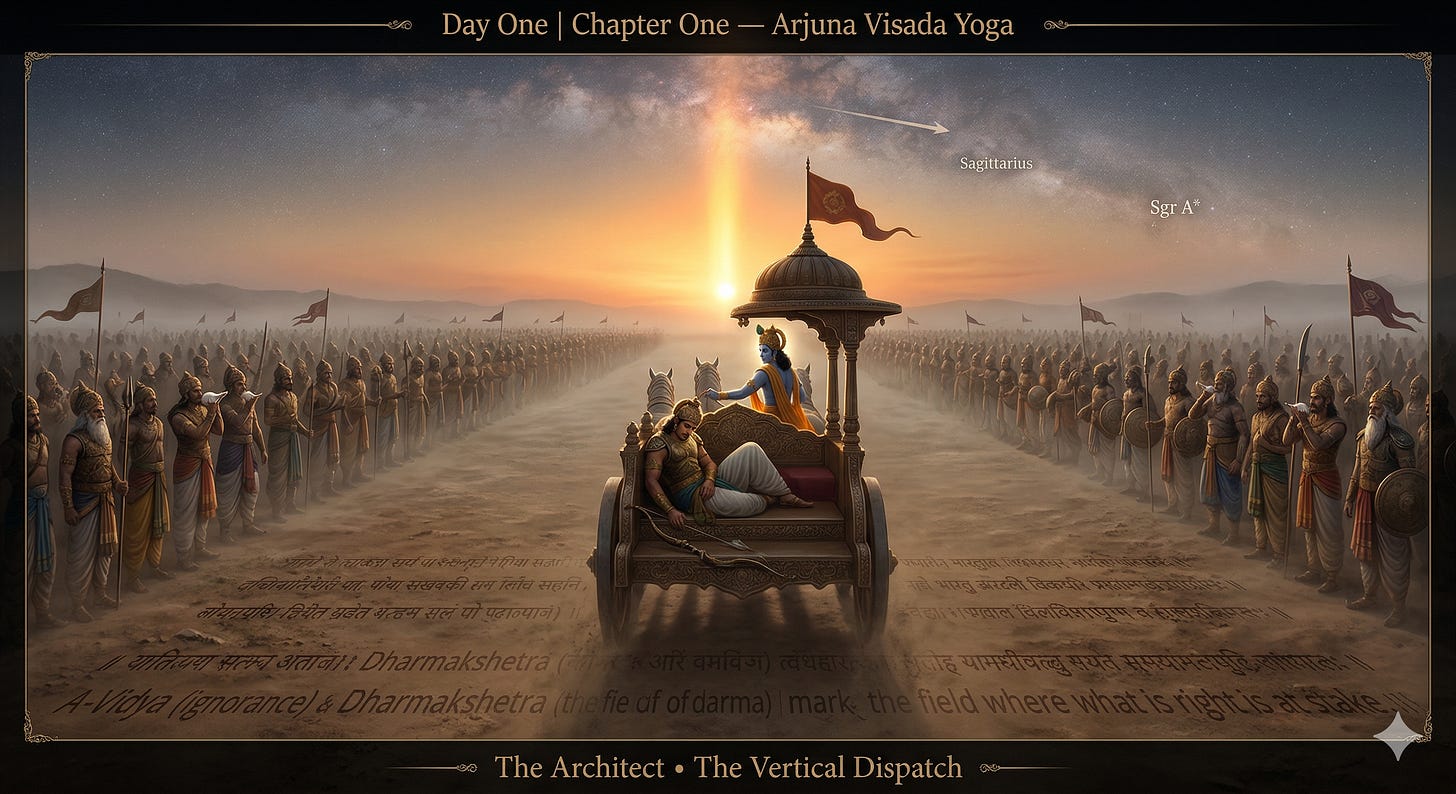 #BhagavadGita #Gita18Days #ChapterOne #ArjunaVisadaYoga #KurukshetraField #KrishnaTeaches #Shankaracharya #Advaita #VedicWisdom #SanatanaDharma #HinduPhilosophy #SpiritualAwakening #Consciousness #AncientWisdom #YogaPhilosophy #Dharma #Moksha #SpiritualSeeker #Avidya #NonDuality #TheVerticalDispatch #TheArchitect