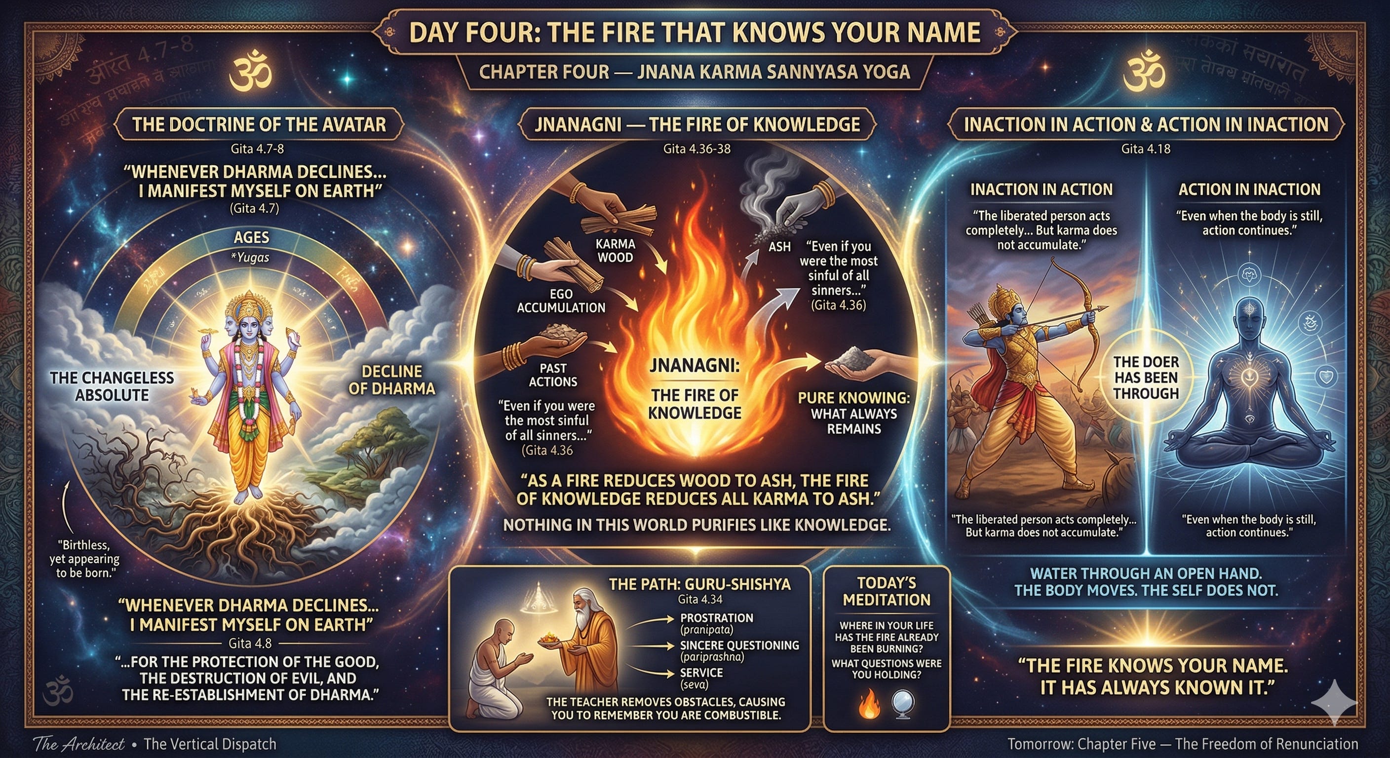 Shankara held this as the most democratising statement in the Gita. It requires nothing from you except the willingness to see clearly. No birth in the right family. No years of prior preparation. No initiation into the correct lineage. Even the one who carries the heaviest burden of past action — even that one — can be carried across by this single boat. Because the burden belongs to the ego, and the fire of knowledge is what sees through the ego to what was never burdened.
