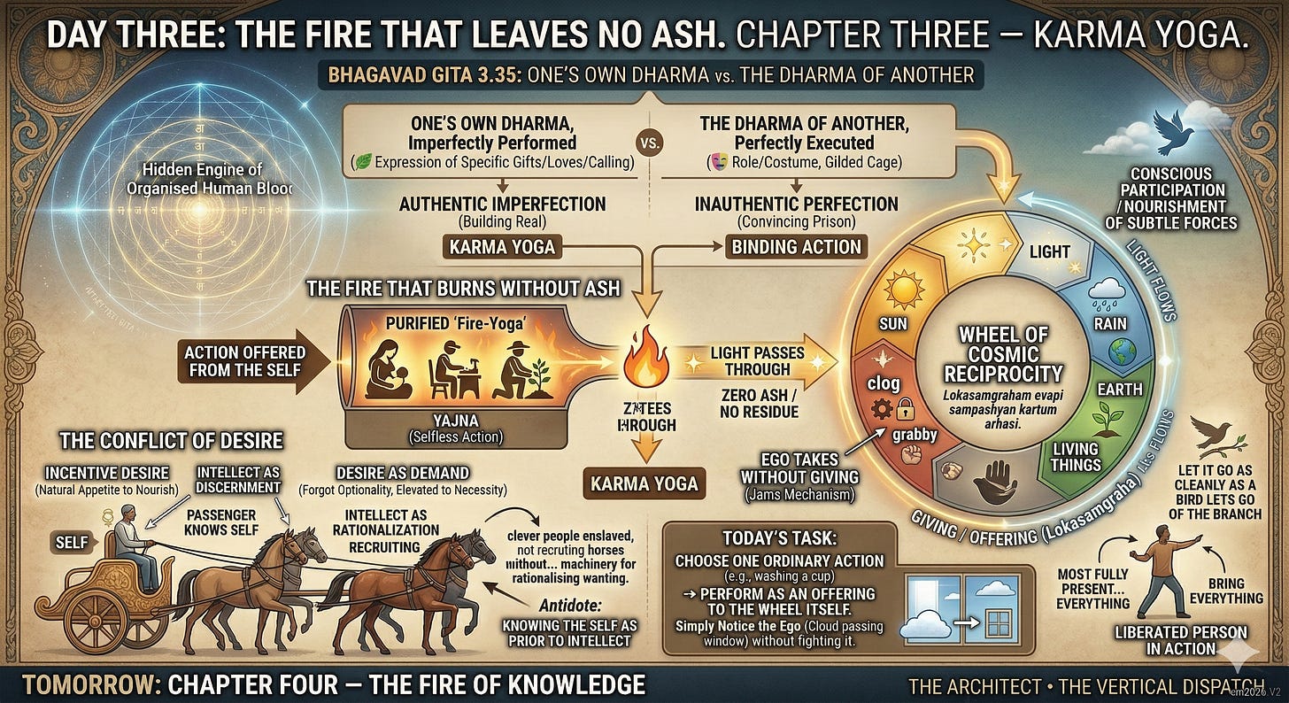 This is the fire that leaves no ash. This is Karma Yoga. This is what Chapter Three is teaching. And it is not, it has never been, separate from who you already are.