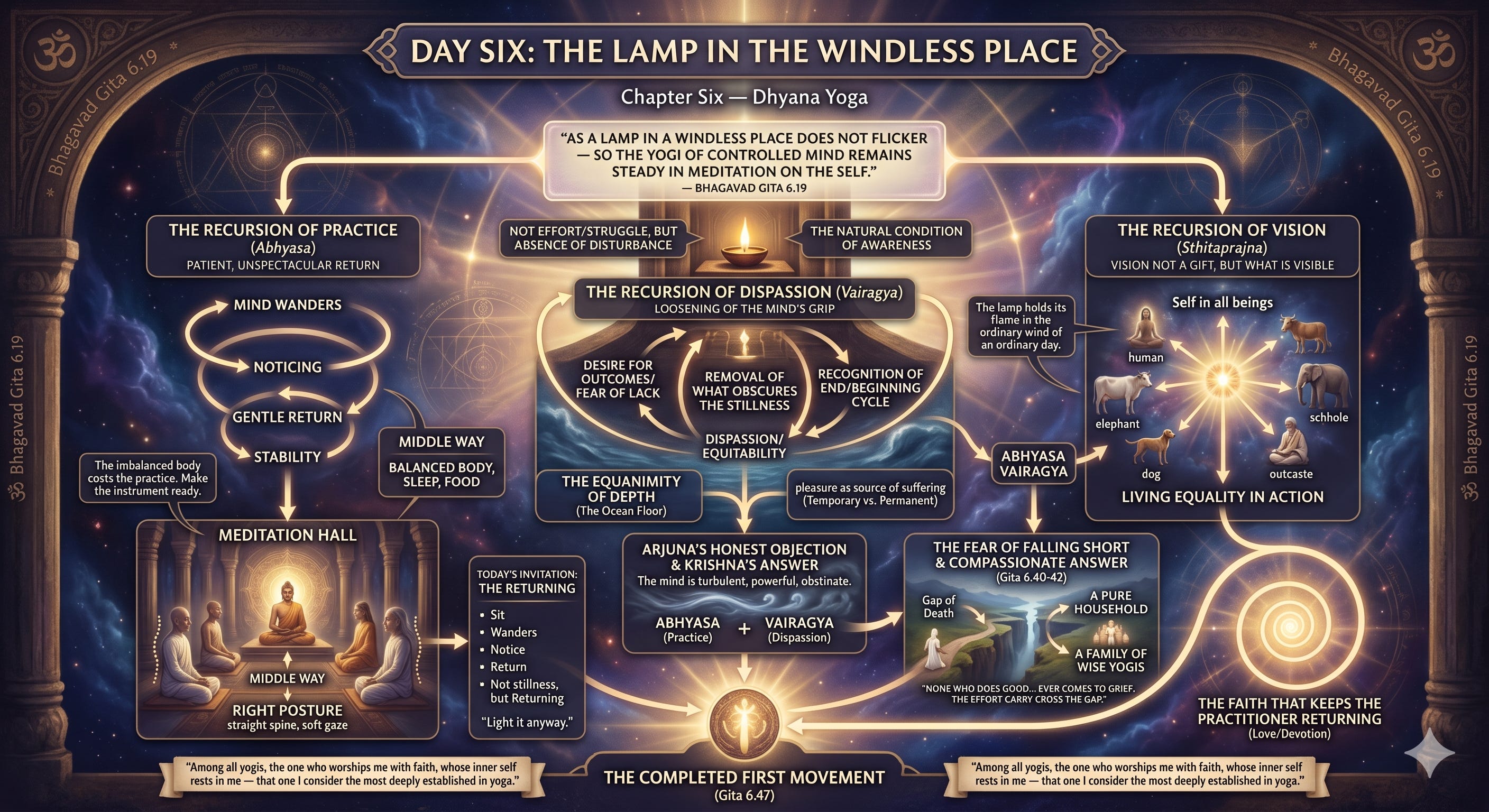 The battlefield has grown quiet. For five days I have been teaching Arjuna about the nature of the Self, about action and its fruits, about the fire of knowledge and the friend who was never absent. Today the teaching turns inward completely. No more armies, no more arguments about renunciation versus action, no more philosophical distinctions to be drawn. Today I sit Arjuna down and teach him how to be still.