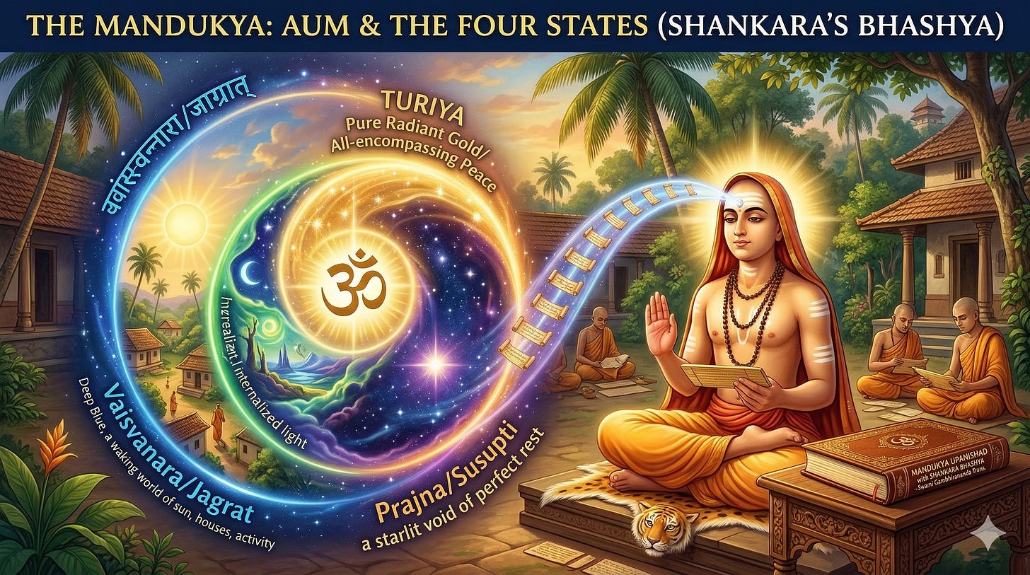 Adi Shankaracharya’s commentary on the Mandukya, together with Gaudapada’s Karikas, forms the foundational textual architecture of Advaita Vedanta. It is the most precise single account of the nature of consciousness available in the Sanskrit tradition. What follows is the complete twelve verses with the essential philosophical substance of Shankara’s commentary on each — the living transmission rather than the letter.