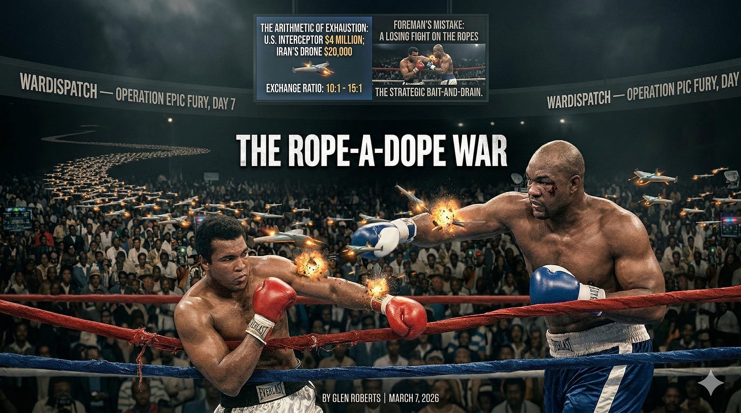 Fifty-two years later, Iran is running the same play. And the United States military — the most powerful, most expensive fighting force ever assembled — is George Foreman. Throwing punches. Burning through gloves. Getting tired. This is the war that the Pentagon’s trillion-dollar procurement machine was never built to fight.