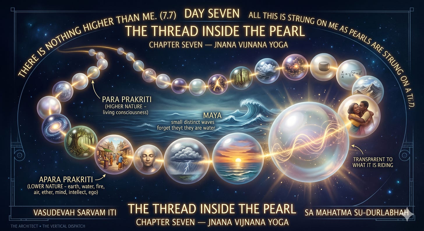 #TheVerticalDispatch #TheArchitect #BhagavadGita #ChapterSeven #JnanaVijnanaYoga #AdvaitaVedanta #Shankara #NonDuality #TheAbsolute #Consciousness #ParaPrakriti #AparaPrakriti #Metaphysics #AncientWisdom #Maya #TheThreadInsideThePearl #Vasudeva #SelfRealization #UniversalDynamics #SpiritualPractice #VedanticPhilosophy #Ontology #TheGroundOfBeing #WisdomTraditions #EsotericKnowledge #InnerJourney #SacredMetaphysics #TheUnseenThread #ConsciousLiving #Awareness