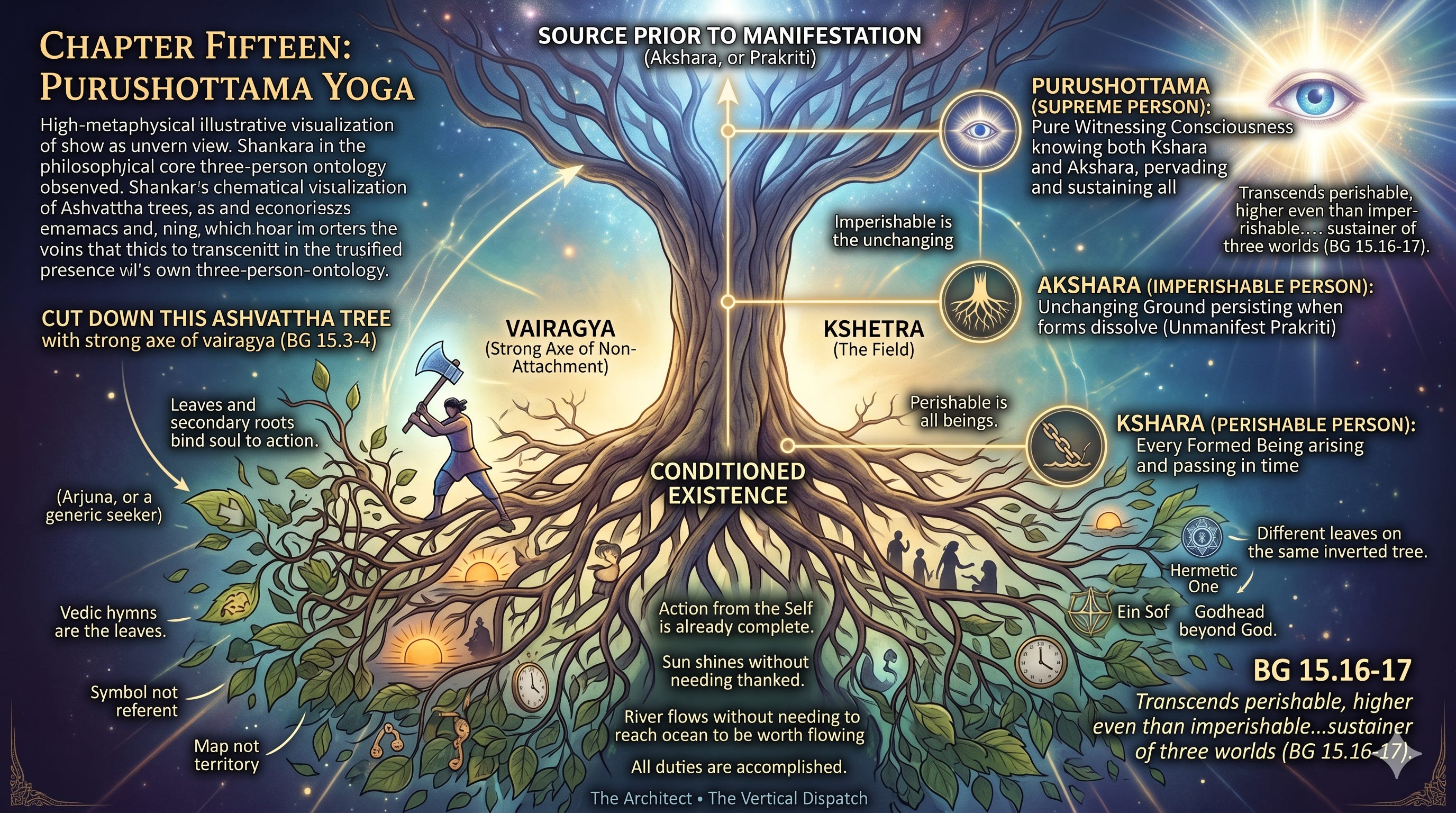 #BhagavadGita #ChapterFifteen #PurushottamaYoga #TheInvertedTree #Ashvattha #AdiShankara #AdvaitaVedanta #Metaphysics #NonDuality #TheSupremePerson #Kshara #Akshara #Vairagya #SacredMetaphysics #UniversalDynamics #TheVerticalDispatch #GlenRoberts #TheArchitect #Project2046 #AxiomaticCorrection #TheGeometryOfEverything #VerticalCausation #WitnessingAwareness #Ontology #FoundationalText #SpiritualGeometry #ThePriorAxiom #Consciousness #TruthIsConsciousness #GodIsLove #LoveIsTruth #SacredMetaphysicsVolume3 #JourneyToTheSelf #OnePlaneTwoAxes #Xorigin #TheAxeOfNonAttachment #BionicSage #ZeroFluff #ProtocolXYZ #LogicIntegrated