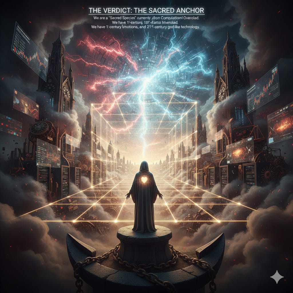 THE VERDICT: The Sacred AnchorWe are SacredThe Vertical DispatchDec 25, 20251ShareSubscribeWe are a “Sacred Species” currently suffering from Computational Overload. We have 1st-century emotions, 18th-century institutions, and 21st-century god-like technology.