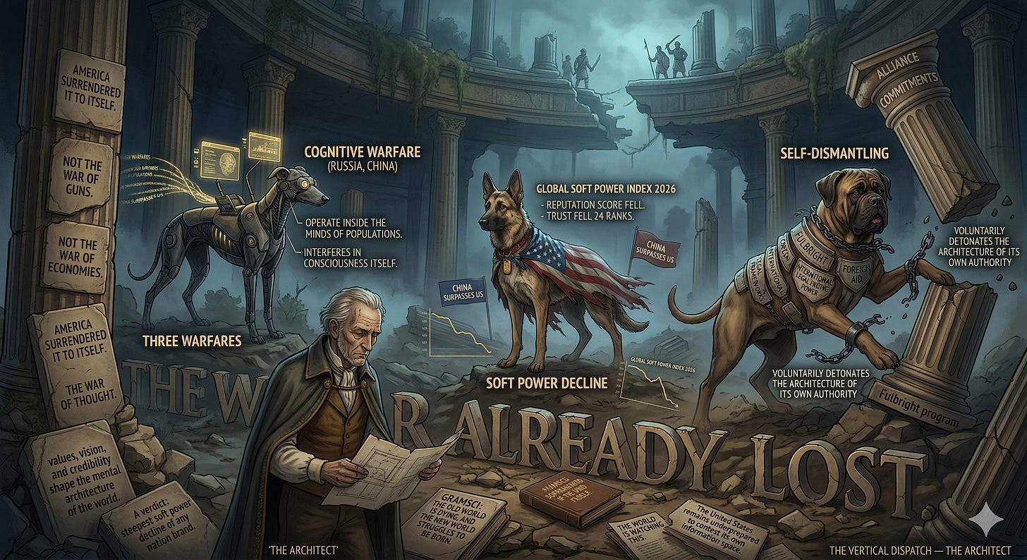 #Geopolitics #SoftPower #CognitiveWarfare #TheWarAlreadyLost #NationalDecline #InformationOperations #GlobalShift #TheArchitect #VerticalDispatch #NewWorldOrder #StrategicAbdication #MentalArchitecture #NationBranding #Davos2026 #GlobalSecurity #AIGovernance #ModernWarfare #ThoughtWar #SovereignIdentity #TheGreatReckoning #ThreeWarfares #Gramsci #SinaiToSanFrancisco #CognitiveDefense #SystemicCollapse #VoluntaryAbdication #GlobalTrustIndex #SoftPowerIndex #TheOldWorldIsDying #FutureArchitecture