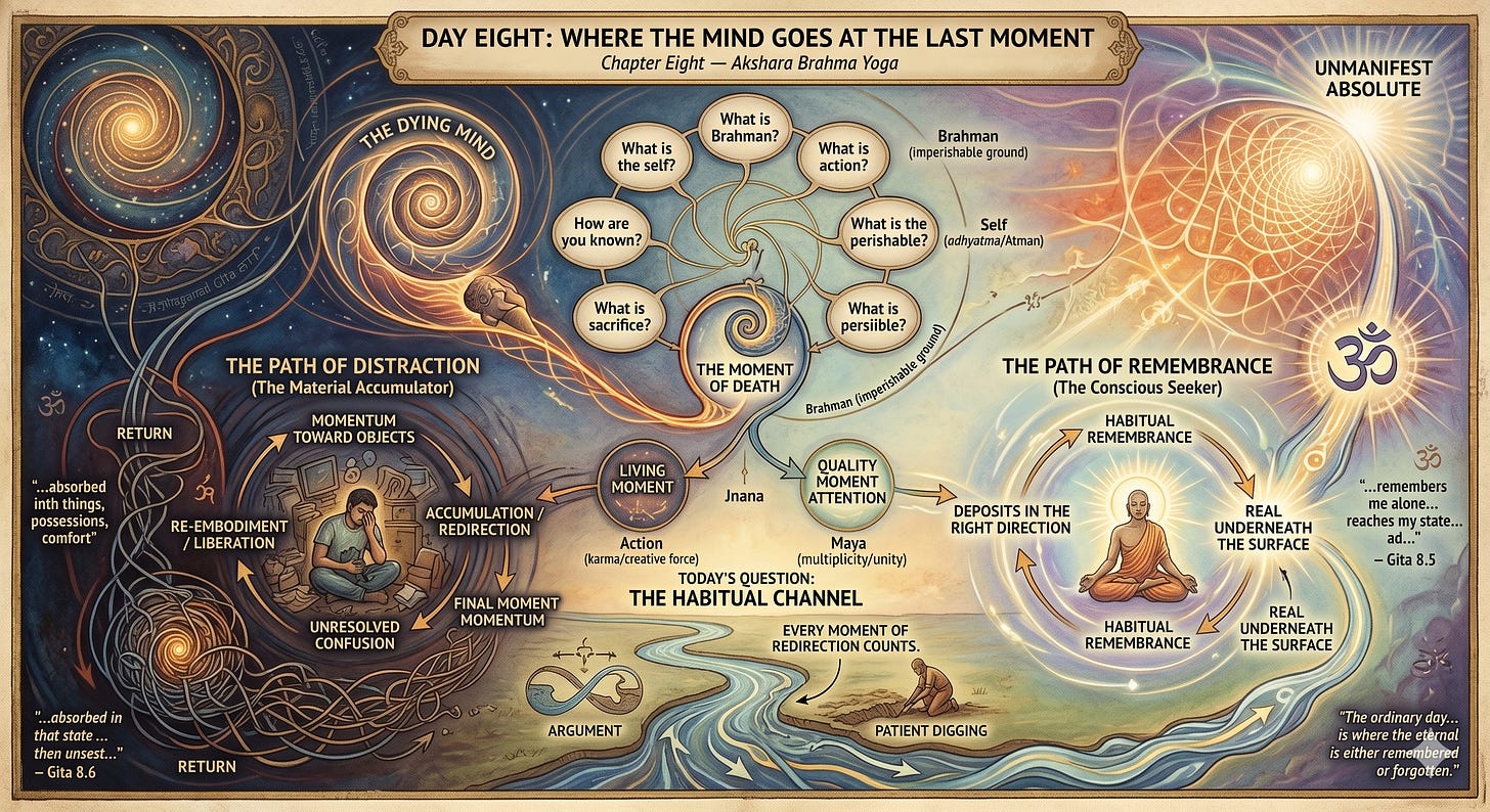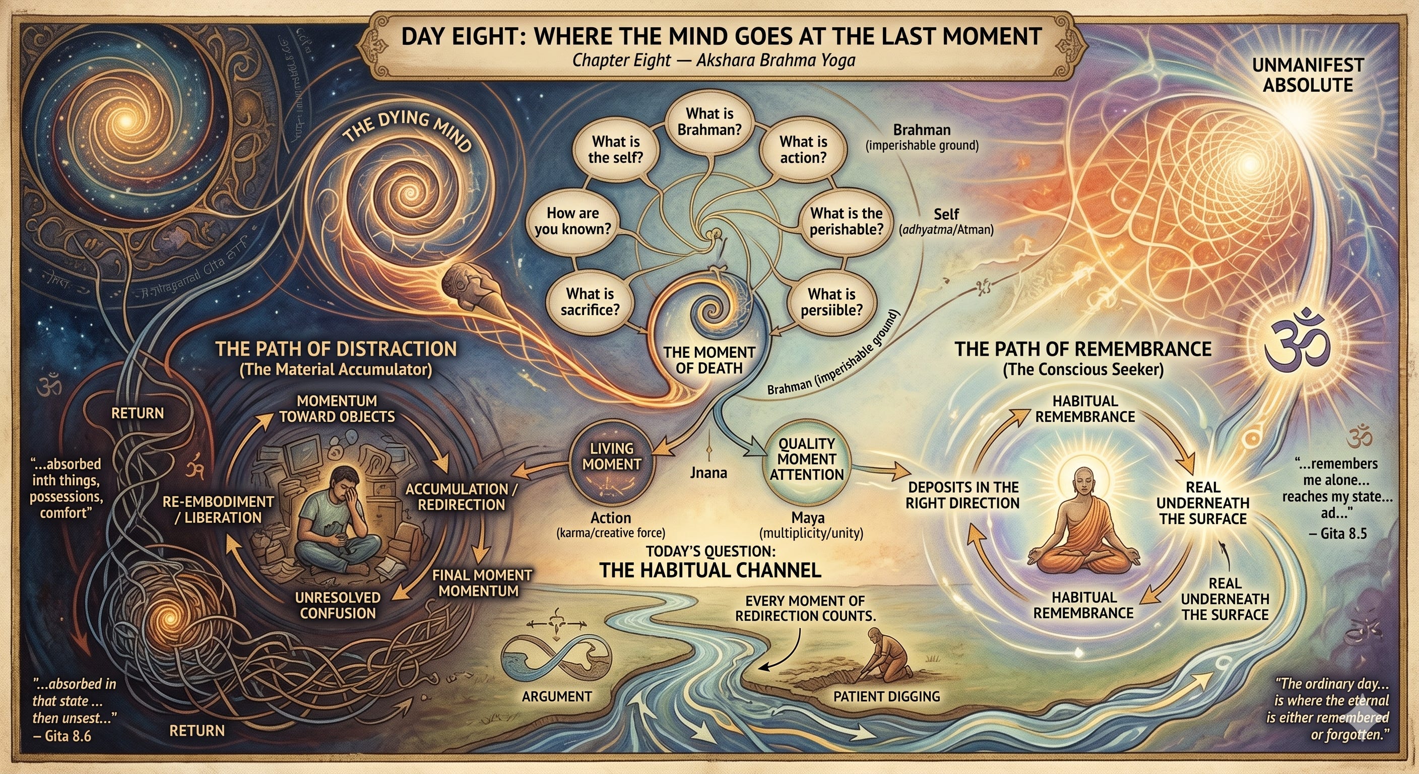 The yogi who understands these two paths, I tell Arjuna, is not confused about what the life is for. All the cosmic architecture — Brahman, the two natures, the moment of death, the two paths — all of it serves one purpose. To make clear to the seeker that the direction of their attention in this unremarkable day is not a small matter. It is the matter. The eternal and the ordinary are not separate domains with the eternal mattering more. The ordinary day, lived with the right orientation, is where the eternal is either remembered or forgotten. That remembering or forgetting is what everything else follows from.
