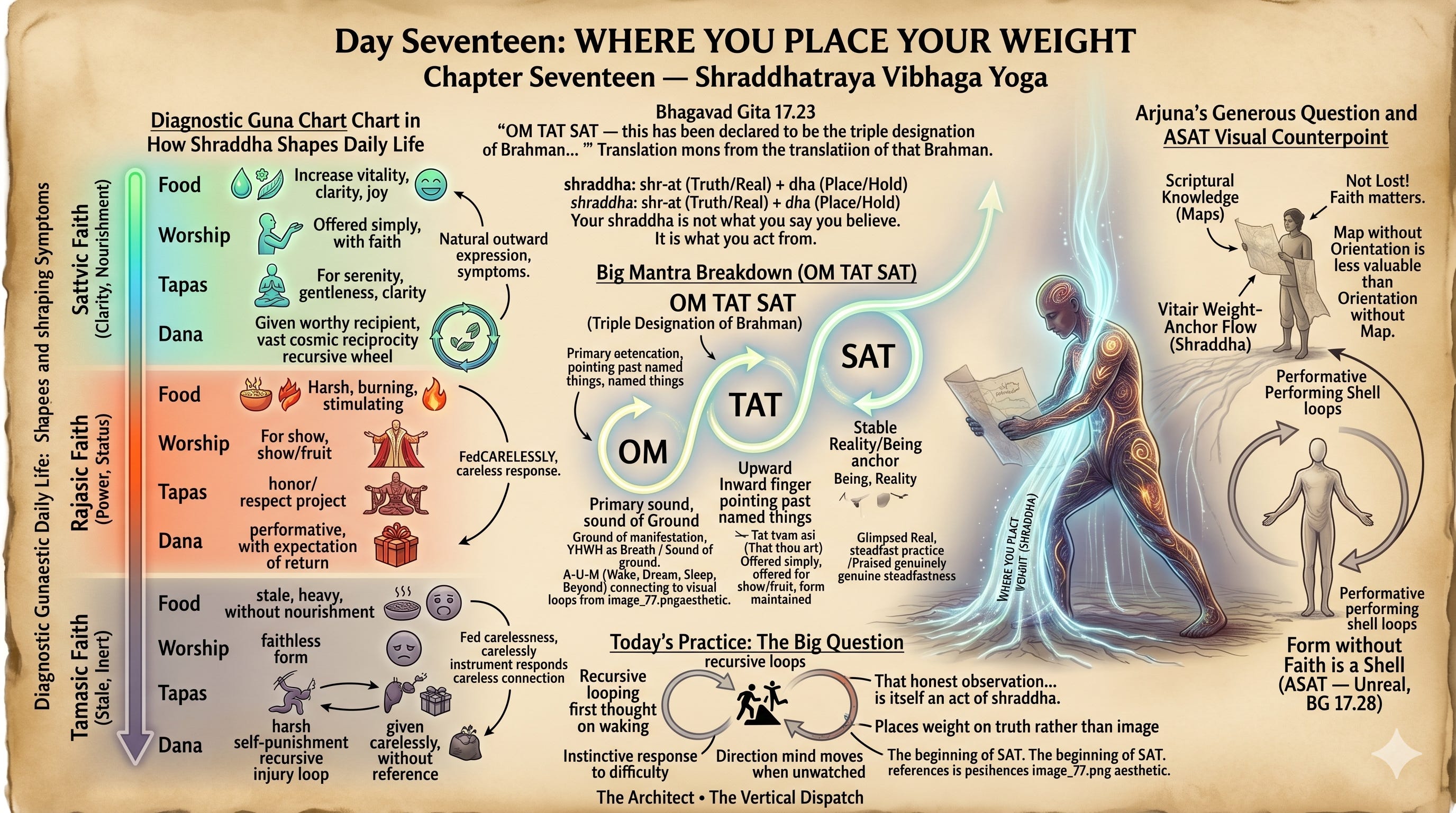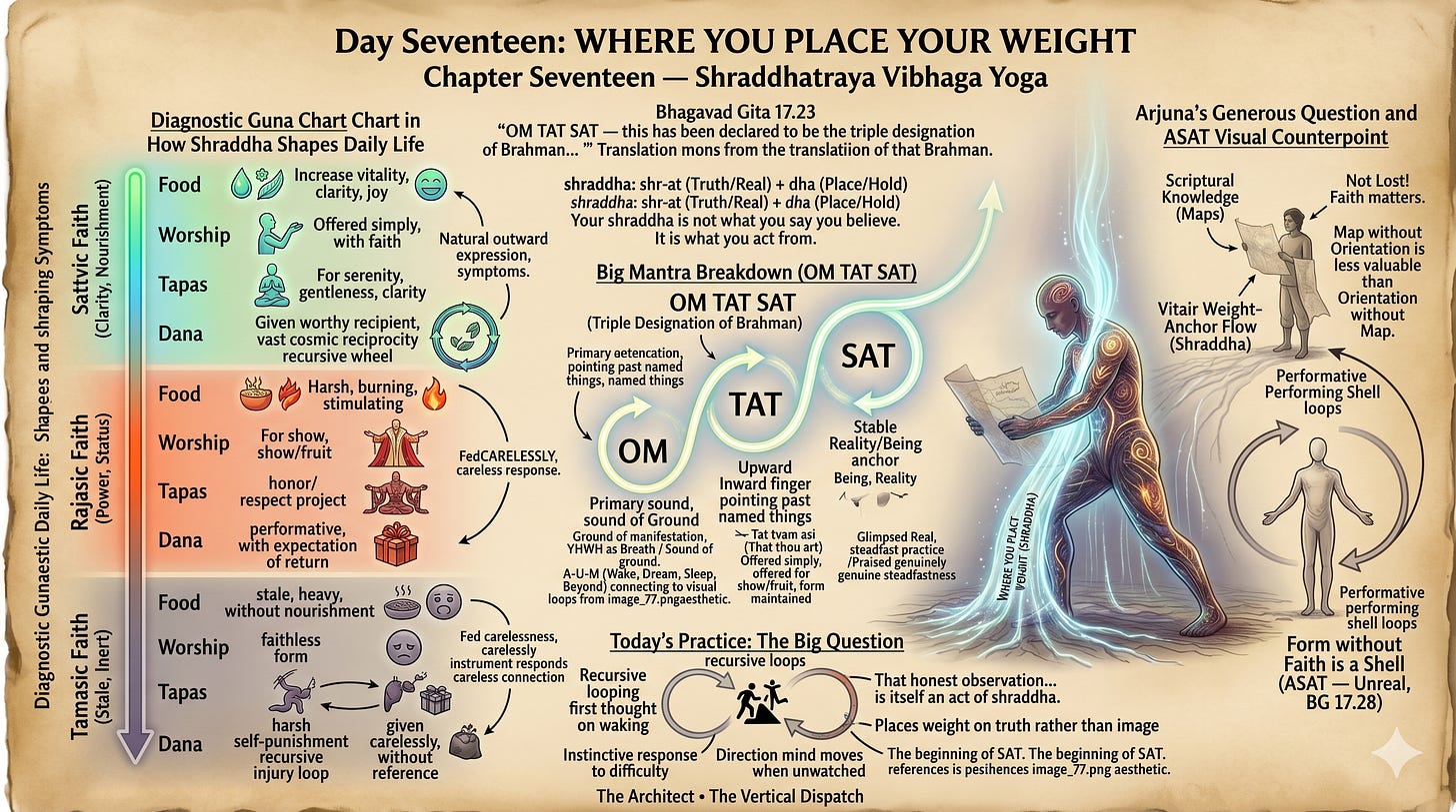 #BhagavadGita #ChapterSeventeen #ShraddhatrayaVibhagaYoga #Shraddha #Faith #WhereYouPlaceYourWeight #OMTATSAT #AdiShankara #AdvaitaVedanta #LivingSanatanaDharma #SanatanaDharma #Gunas #Sattva #Rajas #Tamas #Metaphysics #VerticalDispatch #TheArchitect #Project2046 #SelfInquiry #Spirituality #Ontology #Wisdom #Truth #AtheismToTruth #SacredMetaphysics #JourneyToTheSelf #GlenRoberts #BionicSage #ZeroFluff #ProtocolXYZ #LogicIntegrated #TheKnowerAndTheField #VerticalCausation #Atha #NowTheInquiryBegins #SacredMetaphysicsVolume #WitnessingAwareness #TheInvertedTree #TheTripleGate #Fearlessness #PurityOfHeart #NonDualism #Moksha #EternalOrder #TheScribe #AxiomaticTruth
